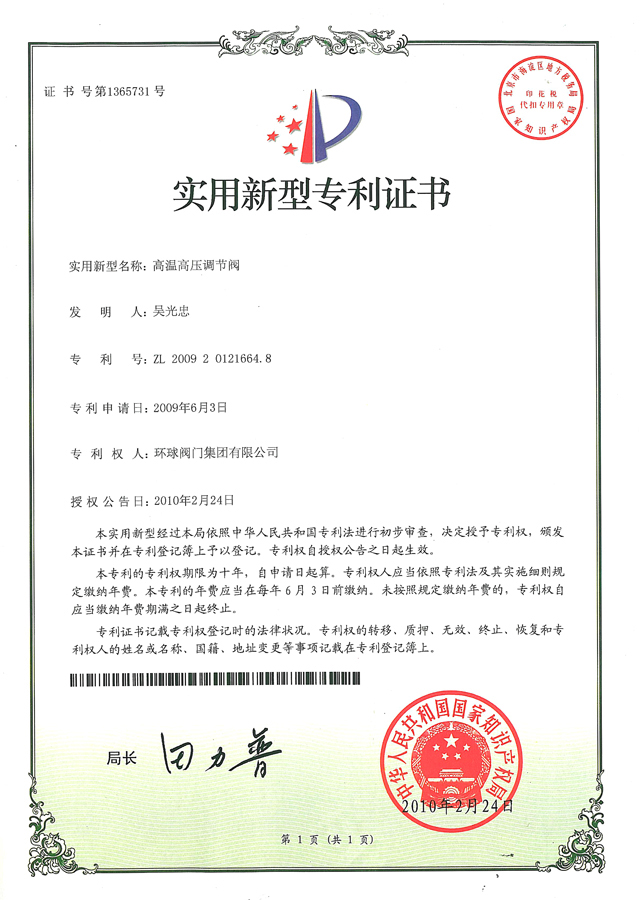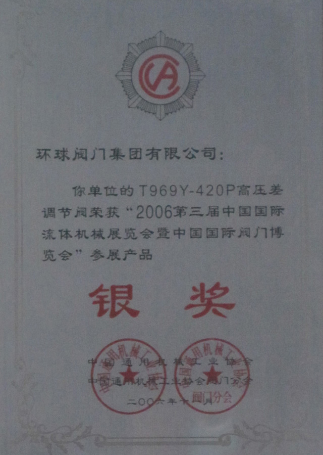 高壓差調(diào)節(jié)閥獲銀獎(jiǎng)證書